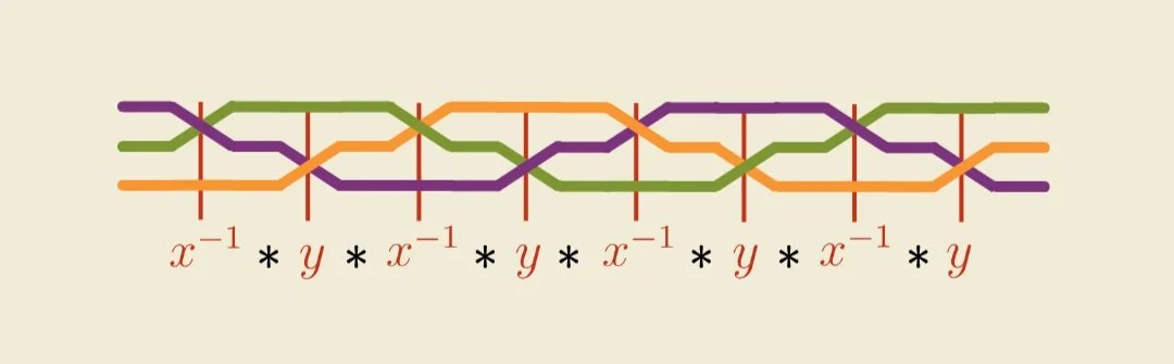 But not all the rules of algebra apply in braid theory. In algebra, x and y commute, or have the same result regardless of order. But in braid theory, this doesn’t apply! Here,