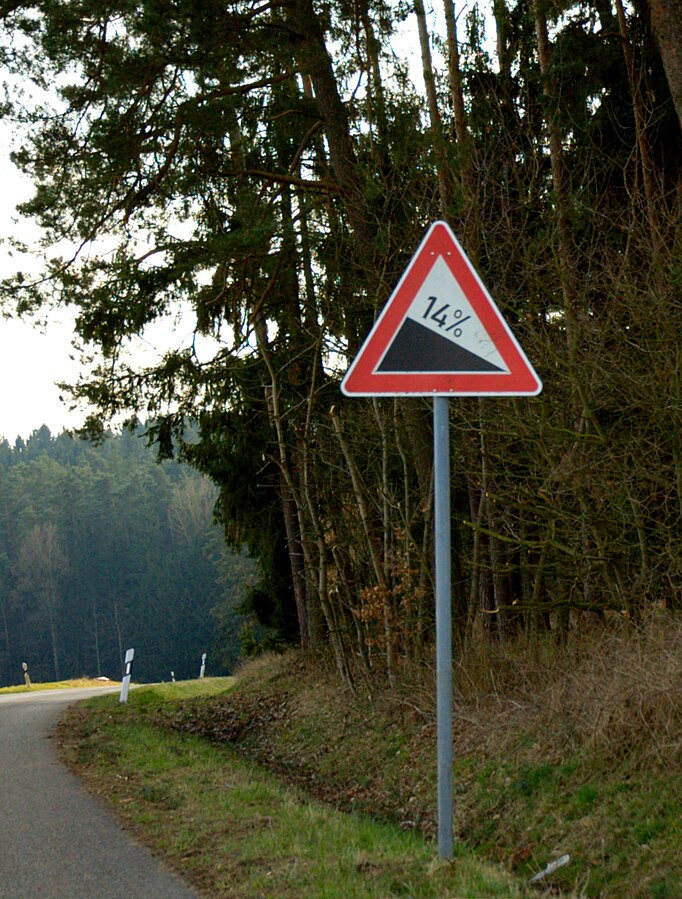 “Verkehrsschild "14% Gefälle" (zwischen Ziegendorf und Bachmühle)” by AlexanderRahm on Wikimedia Commons.