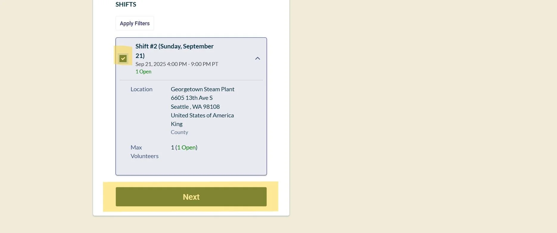 7. If there are multiple shifts for the opportunity, click the box on the left of the shift. Then, select “Next”.