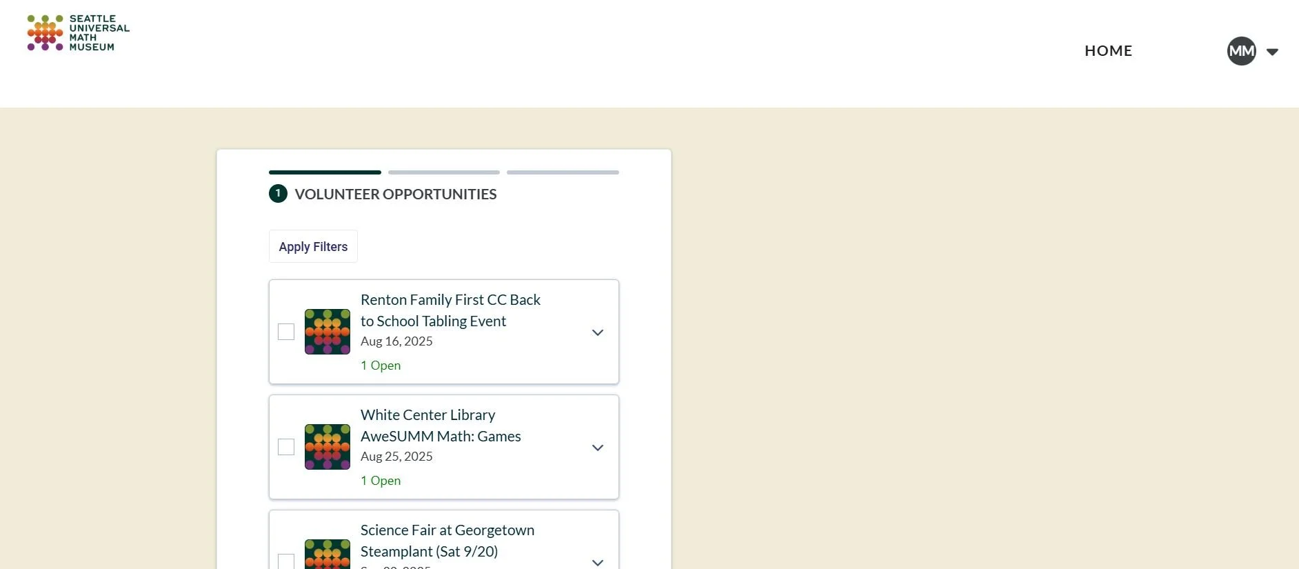 4. You will see a list of all the current volunteer opportunities available where we still need volunteers. You can also hit “Apply Filters” at the top to filter for specific types of events and opportunities.