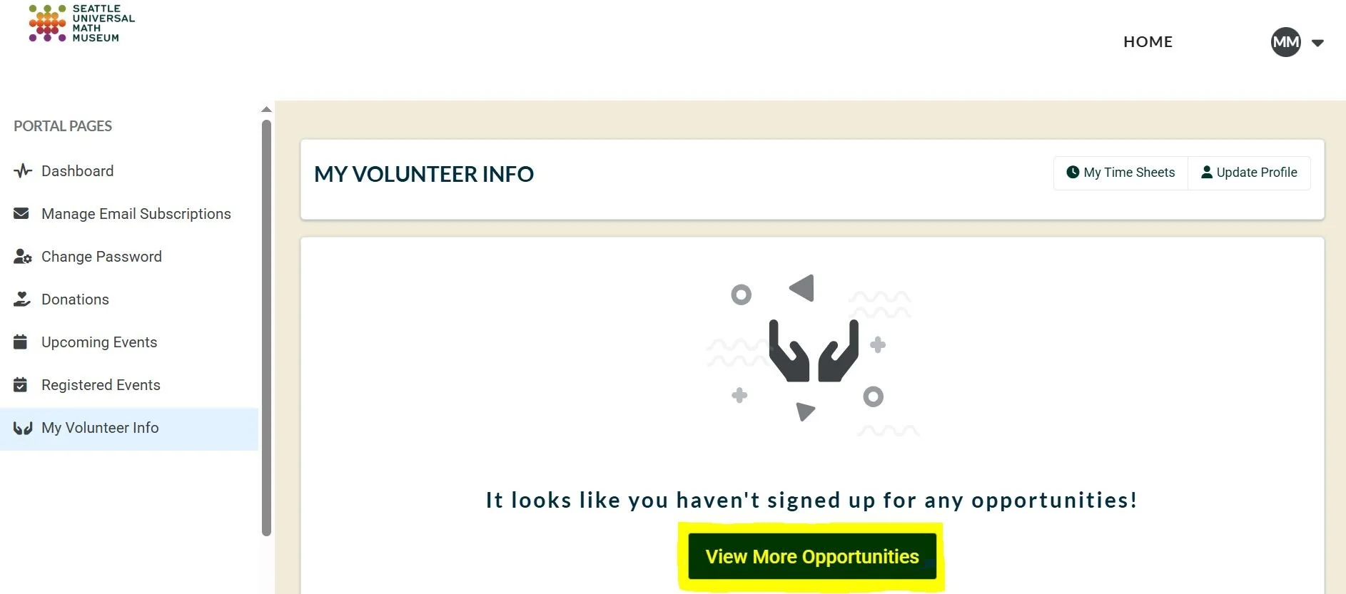 3. You will see any opportunities that you have successfully signed up for listed on this page. Select “View More Opportunities” box in the center of the page.