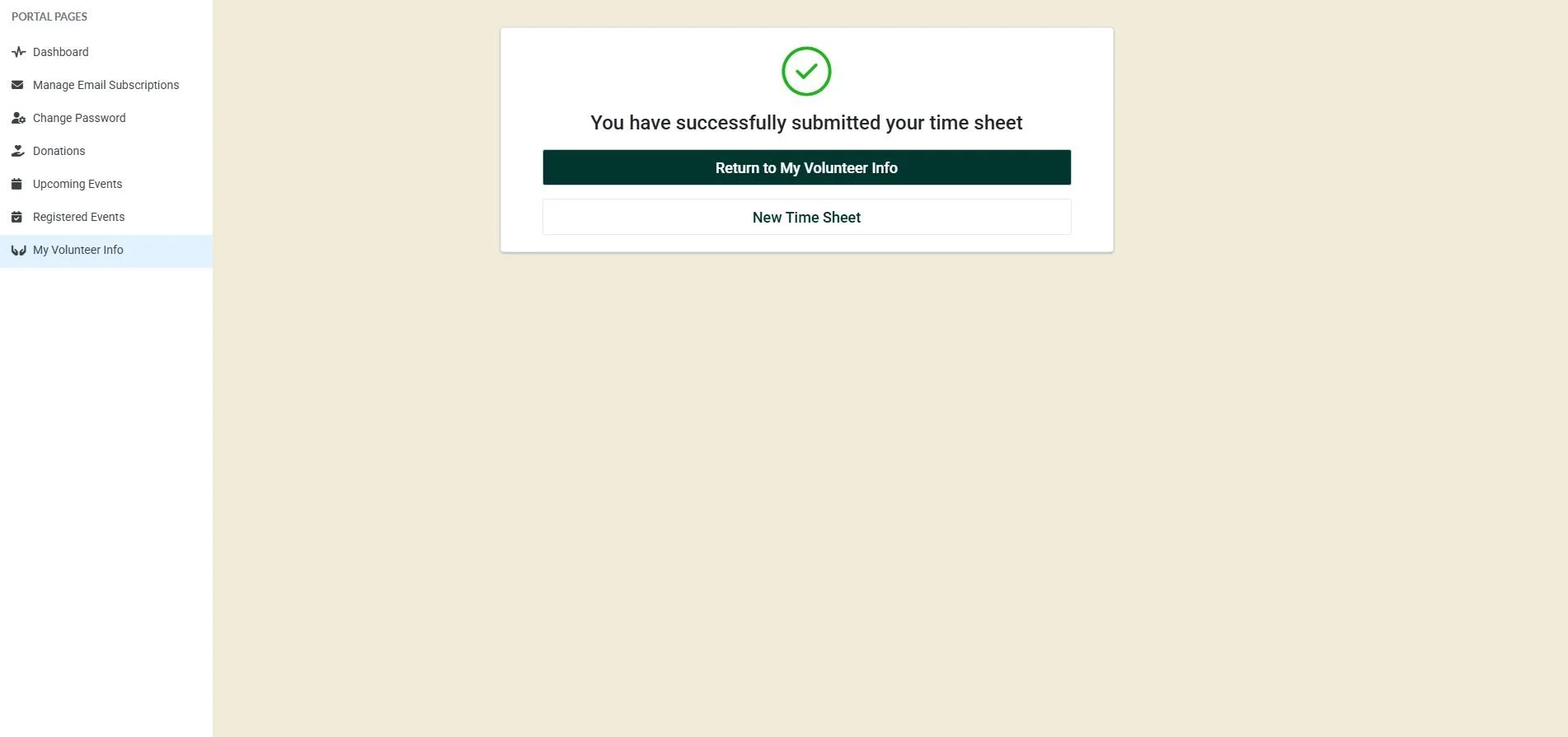 7. To review your submitted time, select “Return to My Volunteer Info” or Select “My Volunteer Info” from the Left Hand Menu Bar. Select “My Time Sheets” from the top banner titled ‘MY VOLUNTEER INFO”.