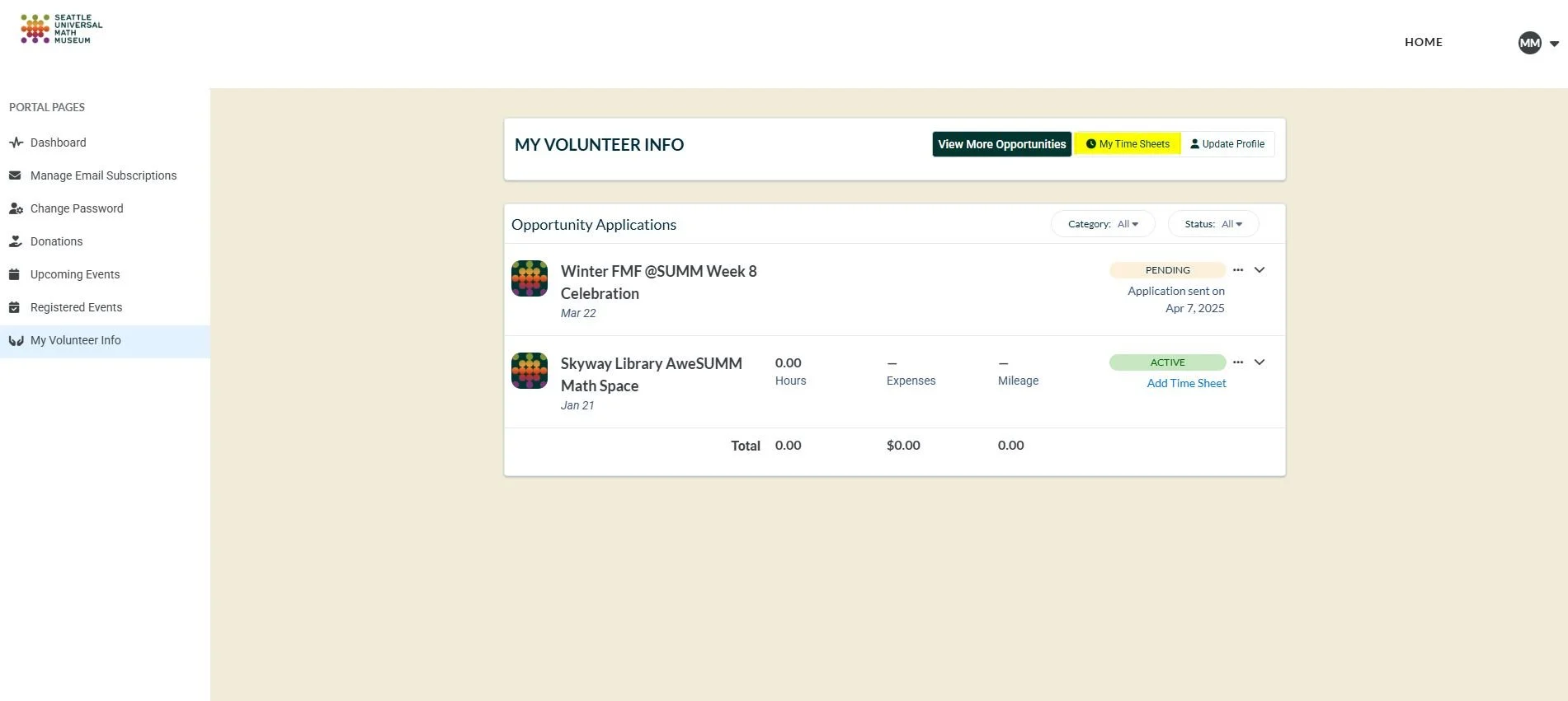 3. You will see any opportunities that you have successfully signed up for listed on this page. Select “My Time Sheets” from the top banner titled ‘MY VOLUNTEER INFO”.