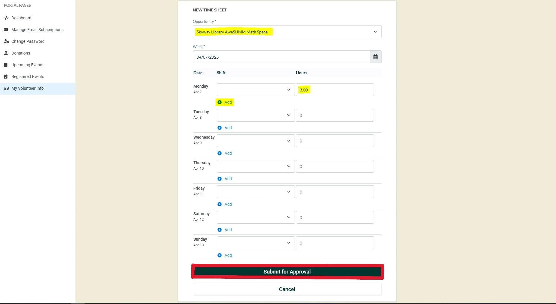 6. Click “Submit for Approval” to submit your time. Your recorded time will be sent to the Volunteer Coordinator who will then review your time for approval.